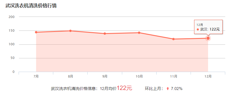 武漢找人清洗洗衣機(jī)一般費(fèi)用在80-200元左右,具體的價(jià)格與洗衣機(jī)的規(guī)格和清洗難度有關(guān),下面為近幾個(gè)月武漢清洗洗衣機(jī)的平均價(jià)格,可供參考: