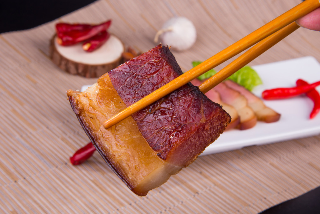 臘肉選用新鮮的帶皮五花肉,分割成塊,用鹽和少量亞硝酸鈉或硝酸鈉、黑胡椒、丁香、香葉、茴香等香料腌漬,再經(jīng)風干或熏制而成,具有開胃、消食等功效。熏好的臘肉,表里一致,煮熟切成片,透明發(fā)亮,色澤鮮艷,黃里透紅,吃起來味道醇香,肥不膩口,瘦不塞牙,不僅風味獨特,且營養(yǎng)豐富。