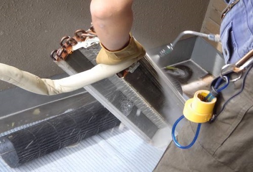 4、噴洗結(jié)束后等候15分鐘左右,要用高溫的水蒸氣進行向里施壓沖刷,把附著在翅片上的贓物沖進水道。將過濾網(wǎng)裝上后,再運轉(zhuǎn)空調(diào)制冷程序15-30分鐘,污水自動隨排水管排出。