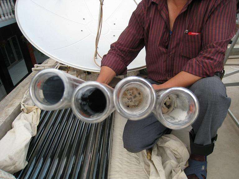 把所有的真空管拆下來(lái),用一根長(zhǎng)的木棍,一頭用綿繩綁緊一團(tuán)綿布,綿布團(tuán)的大小要略大于真空管內(nèi)徑,但也不能太大,感覺(jué)有一點(diǎn)阻力就可以了,慢慢的往真空管里面通,旋轉(zhuǎn)進(jìn)去,再旋轉(zhuǎn)出來(lái),真空管內(nèi)要裝滿水。再用清水清洗一次就可以了。