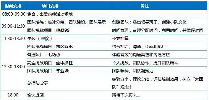 項(xiàng)目目標(biāo):培養(yǎng)學(xué)員間團(tuán)結(jié)一致的精神;培訓(xùn)團(tuán)隊(duì)內(nèi)部及團(tuán)隊(duì)之間的凝聚力;綜合能力、溝通、創(chuàng)新和執(zhí)行;責(zé)任感的培養(yǎng);當(dāng)團(tuán)隊(duì)出現(xiàn)問(wèn)題時(shí),包容比指責(zé)更能鼓舞士氣。
