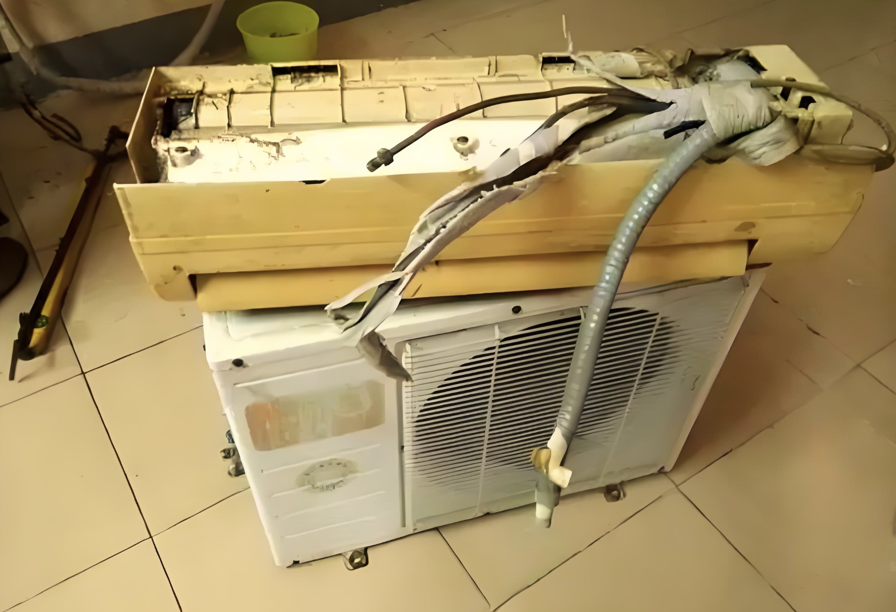3、此時可進(jìn)行拆機(jī)操作,拆下室內(nèi),外機(jī)的聯(lián)接管道,拆下室內(nèi)外機(jī)間的電纜。