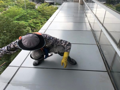 2、吊籃方式:在樓頂架設(shè)吊籃將工人運送到指定位置進(jìn)行施工操作。此施工方式清洗效率較低,成本較高。