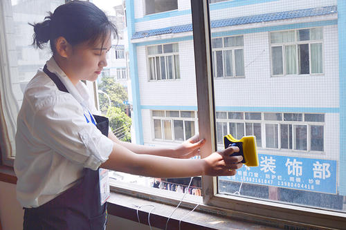 3、擦玻璃:先用毛巾把玻璃框擦拭干凈,再用涂水器沾稀釋后的玻璃水溶液,均勻的從上到下涂抹玻璃,有頑固的污漬用鏟刀清除干凈,再重復(fù)以上工序后用刮子從上到下刮干凈,用干毛巾擦凈框上留下的水痕,玻璃上的水痕用機(jī)皮擦拭干凈。