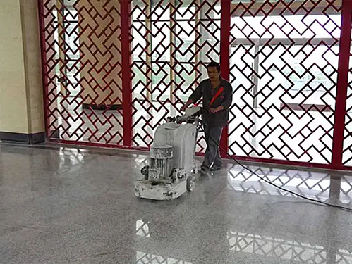 3、待云石膠干燥以后,使用打磨機對整體地面進行打磨,整體橫向打磨,重點打磨石材間的嵌縫膠處(石材之間的對角處)以及靠近墻邊、裝飾造型、異型造型的邊緣處,保持整體石材地面平整.
