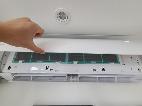 步驟3、撥開外殼,然后可以抬起外殼于空調(diào)上方,能自動卡住固定,不用擔(dān)心掉下來。