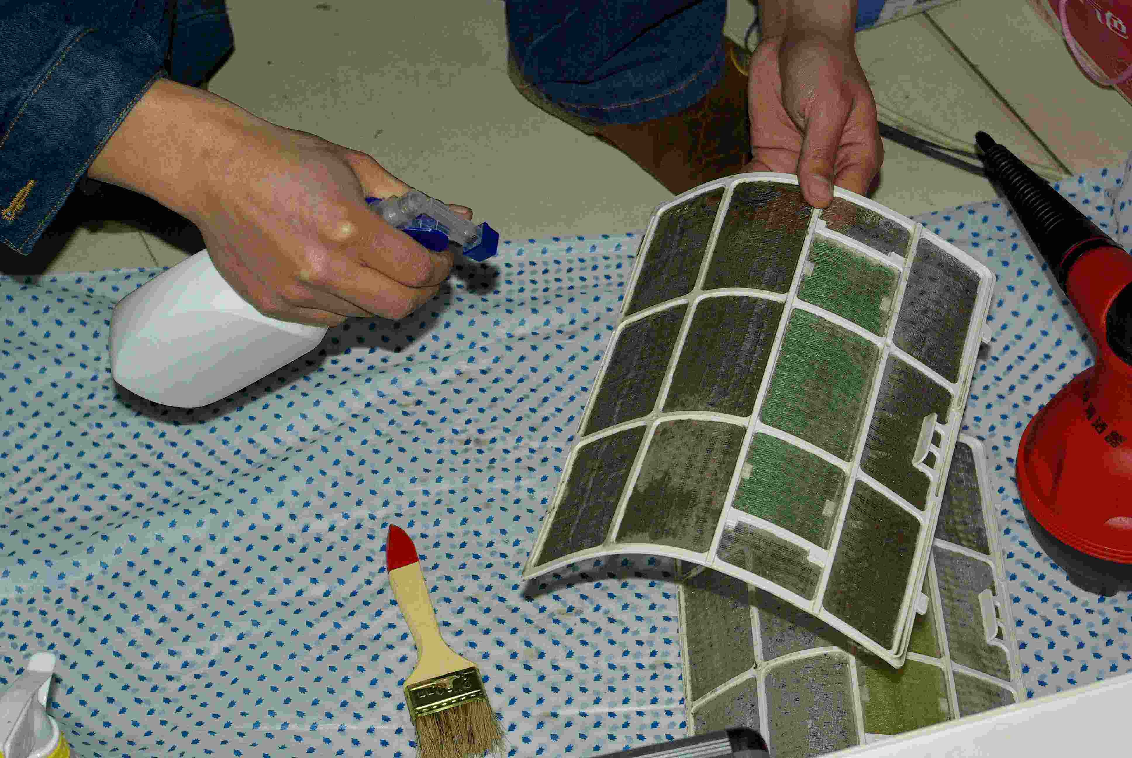 拔掉空調(diào)電源后,使用專業(yè)的空調(diào)清洗劑反復(fù)噴淋散熱片2-3次,建議上下噴淋,這樣可以讓清洗劑的覆蓋更密集。在噴淋過程中需要注意噴頭不要離散熱片太遠(yuǎn),以免噴濺到墻上造成額外的清潔負(fù)擔(dān)。另外需要注意不要忘了噴淋支架后面的和上面的部分。均勻噴淋散熱片后,需要等待大約5分鐘,讓清洗劑充分溶解散熱片上的灰塵并殺死附著的細(xì)菌。然后,連接上空調(diào)電源,安裝好過濾網(wǎng)并蓋上空調(diào)蓋,打開窗戶后,空調(diào)運(yùn)行制冷大約20-30分鐘,即可將散熱片上的灰塵細(xì)菌清除干凈。