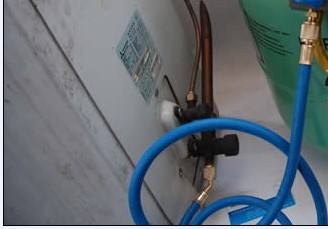 2、將三通截止閥連接三通閥、加氟軟管、壓力表、氟瓶以及真快泵,將氟抽空之后,在開始加氟,一般需要使用精準(zhǔn)的計(jì)量工具對(duì)氟稱重,具體加多少根據(jù)空調(diào)銘牌標(biāo)準(zhǔn)添加。如果你是定頻空調(diào)將空調(diào)設(shè)置制冷與制熱高速風(fēng)狀態(tài),而對(duì)于變頻空調(diào)則設(shè)置成試運(yùn)轉(zhuǎn)狀況,然后再低壓截止閥口,一邊加氟一邊觀察電流表的變化。